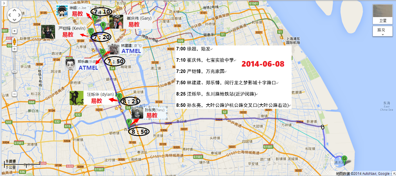 【骑行线路(去程)】:集合地点->沪闵公路à闵浦二桥->沪杭公路(S103)->大叶公路(S324)->东大公路(S324->滨果公路à临港大道->环湖西一路->目的地