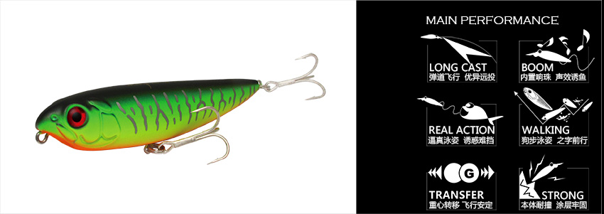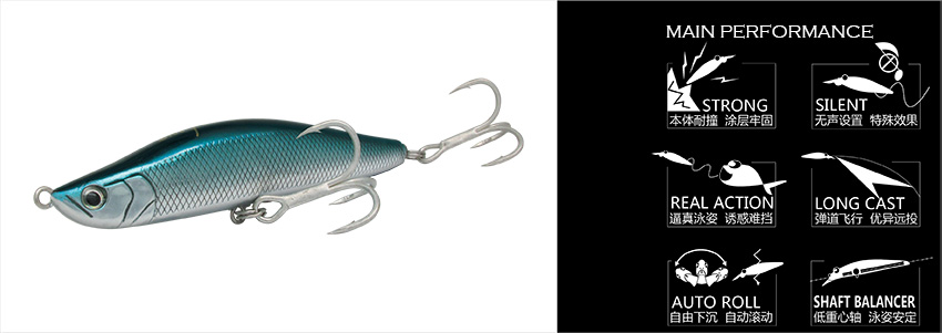 铅笔、米诺和颤游的强强联合,表层到底部,不论何种方式操控,中鱼!匀速收线,缓慢摇摆,如毫无戒心游着的小鱼,猎食鱼岂肯错过;小抽猛拉,如鱼逃窜,高频小抽特别是“狗步”操控时,如同垂死的小鱼最后无力的挣扎,而猛拉再稍加停顿时,又如四处游逃还被吓呆的小鱼,诱惑无可抵挡;下沉自颤,头部下倾,加上腹尾两枚银色三本钩鱼鳍般的同频颤动,目标鱼最易从腹下发动雷霆一击,多数腹钩中鱼,而“自沉”配合“匀收”或“小抽”,则可在水层中进行“W”搜索,全泳层出击!