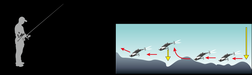 路亚抛出后稍等下沉,视需要下沉到一定深度后,人面向水面,收紧余线,向上扬竿,力度视情况需要,可重可轻,然后放下竿尖松线,再让路亚下沉;路亚搜索深度范围很大,适合大水面搜索鱼所在泳层,在鱼索饵意愿不积极时,这种轻缓的手法非常有效。