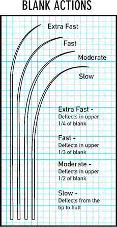 慢调路亚竿弯曲点在鱼竿的中后部,依靠鱼竿的整体受力发力,因此鱼竿的整体感觉比较柔和。通常“1 / 9调”和“2 / 8调”的Bass竿通称为快调(Fast Action),“3 / 7调”的Bass竿通称为中调(Medium Action),“4 / 6调”和“5 / 5调”的Bass竿通称为慢调(Through Action)。在使用软饵钓组中,为了精准捕捉鱼讯和细腻操控拟饵,一般使用快调Bass竿。使用硬饵钓组更多是为追求泳姿表现,或在小范围内呈现大幅度动作,通常使用慢调Bass竿。泛用型Bass竿或有抛投要求的Bass竿一般为中调。