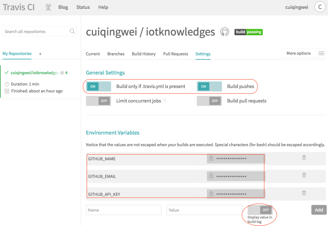 添加一个环境变量(Environment Variable),命名为 GITHUB_API_KEY ,之后将刚刚生成的Token复制进去,这在之后会用到。接下来你还需要创建两个环境变量作为Push的身份,一个是你的名字,还有一个是你的邮箱,当然如果对邮箱和名字没什么隐私那不设置也可以。这两个变量可以分别命名为 GITHUB_EMAIL 和 GITHUB_NAME。GITHUB_NAME请务必注意设置成你Profile链接里的那个名字,即https://github.com/[user_name]这里这个值。设置完之后,注意要把下面那个“*Display value in build log”关掉,否则这一安全措施就没用了。还有一点,记得把“Build pull requests*”关掉,否则在有Pull Request的时候不论其是否合格都会自动将Pages更新。
