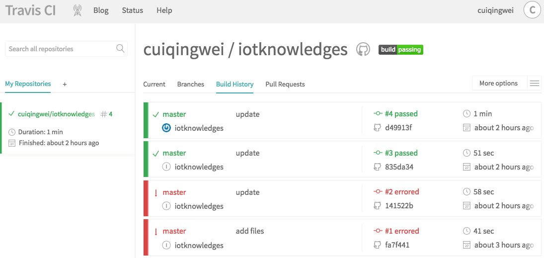 由于push的时候有-f参数,GitHub上的历史都将被复写,并且因为我们是本地新创建的一个repo,所有历史都是空的,所以构建完成之后每次在GitHub上都只能看到一个commit ,如果成功的话,应该每次更新源码工程之后等一两分钟都能看到你自己在GitHub Pages所在的工程或者分支自动发送的commit,如果失败的话可以看一下下面完整的 .travis.yml 文件: