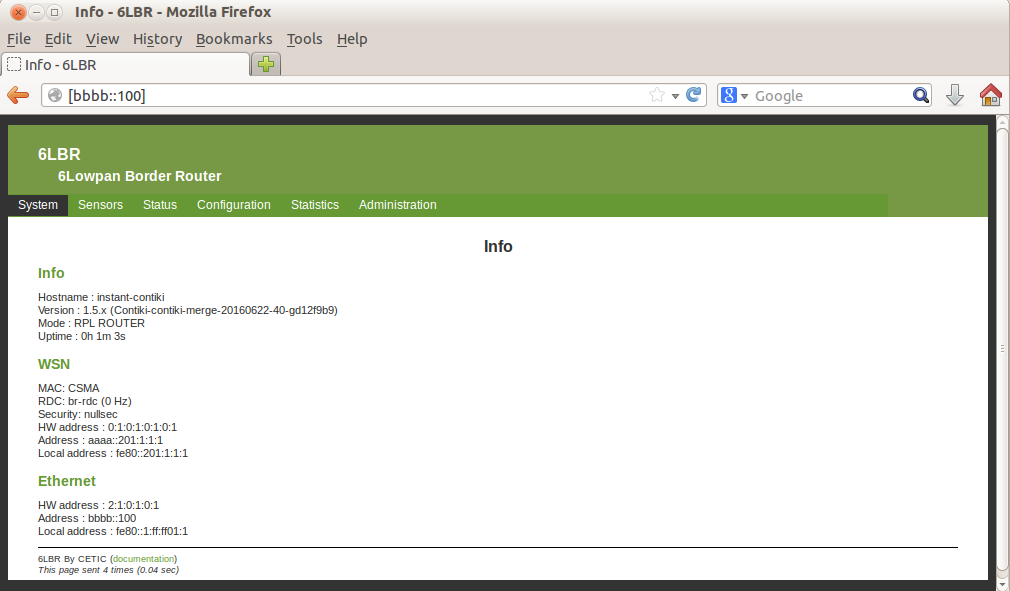 打开浏览器,地址栏输入 [bbbb::100] 回车,看到如下界面就算成功了!