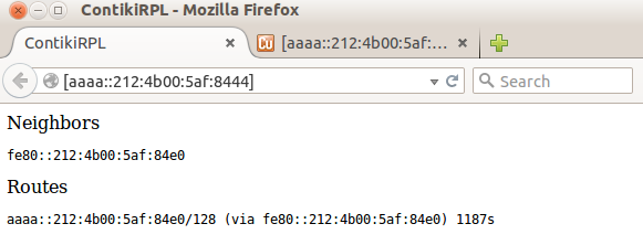 ********SLIP started on ``/dev/ttyUSB0'' opened tun device ``/dev/tun0'' ifconfig tun0 inet `hostname` mtu 1500 up ifconfig tun0 add aaaa::1/64 ifconfig tun0 add fe80::0:0:0:1/64 ifconfig tun0 tun0 Link encap:UNSPEC HWaddr 00-00-00-00-00-00-00-00-00-00-00-00-00-00-00-00 inet addr:127.0.1.1 P-t-P:127.0.1.1 Mask:255.255.255.255 inet6 addr: fe80::1/64 Scope:Link inet6 addr: aaaa::1/64 Scope:Global UP POINTOPOINT RUNNING NOARP MULTICAST MTU:1500 Metric:1 RX packets:0 errors:0 dropped:0 overruns:0 frame:0 TX packets:0 errors:0 dropped:0 overruns:0 carrier:0 collisions:0 txqueuelen:500 RX bytes:0 (0.0 B) TX bytes:0 (0.0 B)