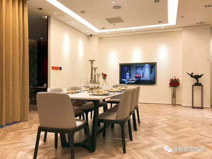 餐厅是最需要调光的,摩根可以通过全宅调光,增加空间的个性,突出食物的美味,打造一个光线柔和的空间。我们去高档餐厅吃饭,会发现里面的灯光都不会很亮,给人一种温馨,舒适的感觉。如果对餐厅做了调光的话,我们在家就可以享受到高档餐厅才有的灯光环境氛围。当节假日,比如情人节、结婚纪念日,生日,吃西餐时,我们把餐厅的灯光调至50%、10%,就可以打造出烛光晚餐的效果,这是一件多么浪漫的事情啊。