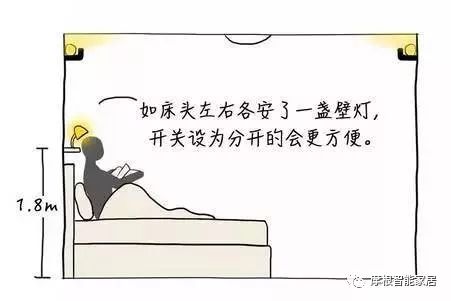 局部照明是为了让人在床上进行税前活动和方便起夜设置的。可以在床头距地约1.8m的两段墙壁,安装不占空间的壁灯。或者设置床头柜台灯或者落地灯也可以。