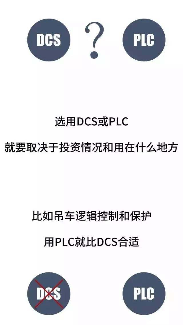 PLC一般用在小型自控场所,比如设备的控制或少量的模拟量的控制及连锁,而大型的应用一般都是DCS。当然,这个概念不准确,但很直观,习惯上我们把大于600点的系统成为DCS,小于这个规模叫做PLC。